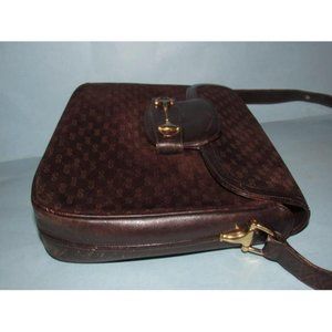 The bag is a large, envelope top, shoulder purse. The body is made of dark brown micro Guccissima print embossed suede and leather. It is a square shape and has bold gold hardware, including great horse bit equestrian accents at the center where it closes and at the sides where the strap is attached! The purse has multiple pockets, so it can hold a lot more than you might think!