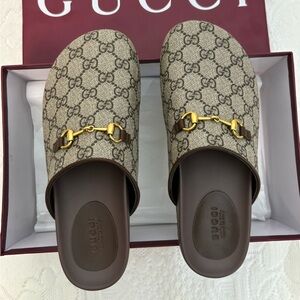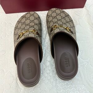 Stylish Gucci mules with iconic monogram pattern. Features brown tones and gold accents.