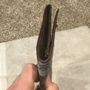 Great wallet. Very clean. Is pre-loved and vintage. See photos please. Does have loose corner as shown in picture. That would be an easy fix. Note that this is a vintage piece. Snap and zipper work.