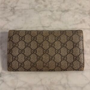 Stylish Gucci wallet with iconic brown monogram. Features a vibrant pink heart detail. Ideal for a chic touch. VERY used, some peeling of leather and over all signs of use