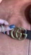 Elegant Gucci belt with signature monogram pattern. Features a striking gold GG buckle.