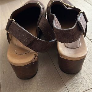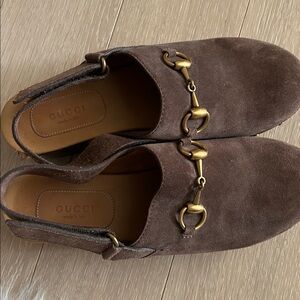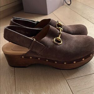 Elegant brown suede mules. Features gold hardware. Comfortable and stylish.