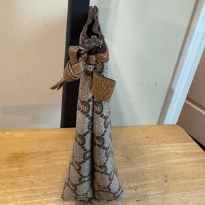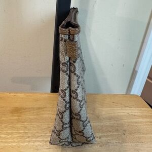 This Gucci toiletry bag showcases a sophisticated brown color with the iconic GG monogram pattern, making it a stylish choice for organizing your essentials. Crafted with attention to detail, it features a durable coated canvas material and a convenient zipper closure. The brown leather trim adds a touch of elegance, ensuring this bag is both functional and fashionable. SN: Worn Off; Size:7x11x2.5; Condition: Very Good; Exterior has no cracks, corners have minor rubs; Interior is clean, no smell. Can easily convert to crossbody.