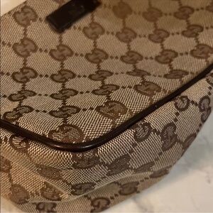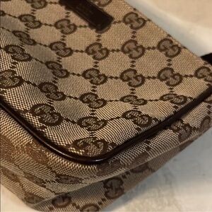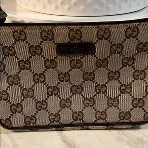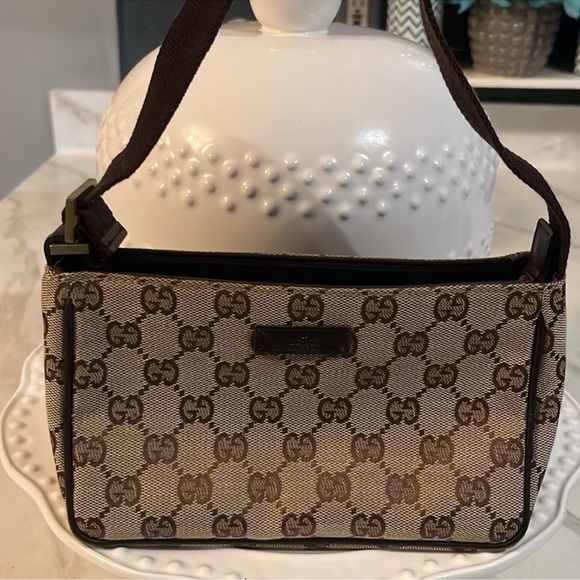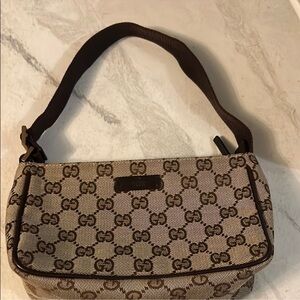 Stylish Gucci handbag with iconic GG pattern. Elegant and versatile design. This cute pochette styled Gucci bag is in very good condition.