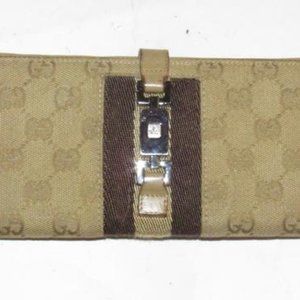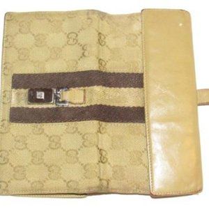 Gucci, camel large G logo print canvas and camel leather with a brown and camel stripe and chrome 'Jackie O' style push button closure, XL size, wallet with change purse, checkbook holder, chrome hardware, and lots of card slots! 7.5" x 4" x 1.5" (when full); Serial #: 05479 213313. Wear and aging consistent with pre-owned vintage item. Please see photos for more details. All measurements are approximate. Item #: 24531033.