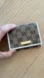 Elegant Gucci wallet with signature pattern. Beige and brown canvas with white trim. Gold-tone logo accent.
