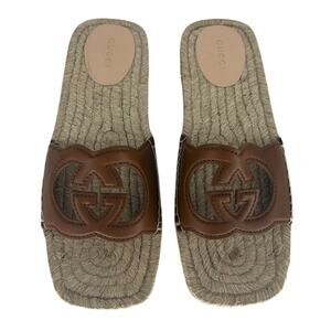 These are authentic Gucci Carlos Slide Espadrille Sandals, crafted in brown leather with signature Interlocking GG cut-out detailing across the upper. The sculpted cord-wrapped platform base and durable rubber sole offer style and traction, while the open-toe slide-on silhouette makes these a comfortable yet elevated choice for resort, beach, or streetwear looks. Finished with polished detailing and premium craftsmanship, these flats reflect Gucci’s refined take on warm-weather footwear.