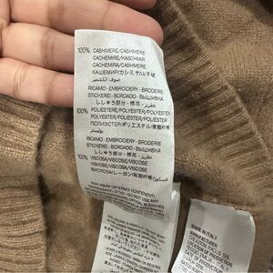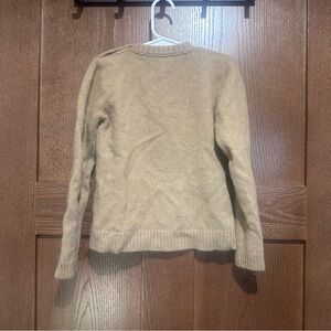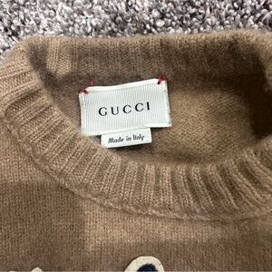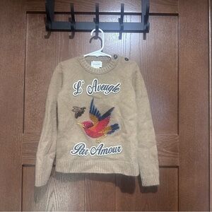 Chic Gucci sweater in tan. Features colorful bird and text design. Stylish and cozy.