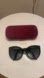Gucci Cat Eye Black Sunglasses with golden logo temples and a logo on a lense