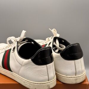 Stylish Gucci sneakers in white leather. Features iconic black and red stripes. Perfect for casual wear.
