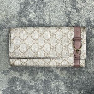 Gucci Continental Long Wallet Monogram GG Supreme Ivory Beige Belt Buckle Flap