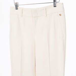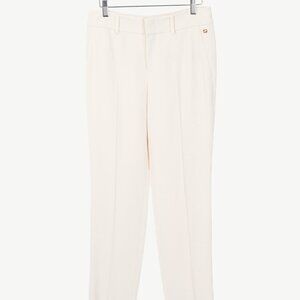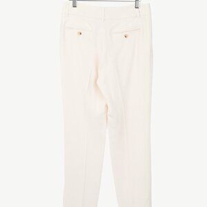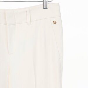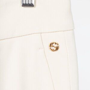 Made in Italy, these trousers from Gucci circa 2012 are crafted in a cream imperial stretch cady crepe, and feature a front double hook and zip fly closure, a banded waist, belt loops, a gold-tone interlocking GG detail on the front left, faux front slash pockets, back buttoned welt pockets, straight-cut legs, and ankle-length hems.
