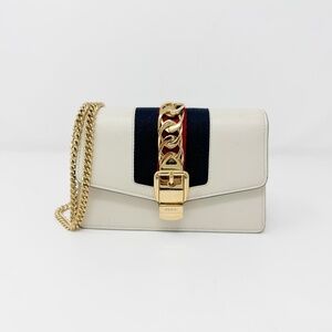 Gucci Cream Leather Web Mini Sylvie Chain Bag. Gold-tone hardware. Fold-over flap with a flip lock closure. Webbed stripes. Chain-link strap. Suede-lined interior with a slip compartment. Tonal stitching.