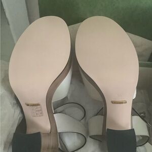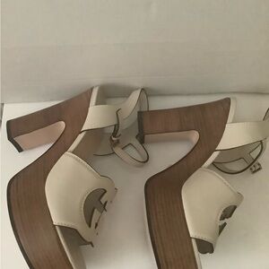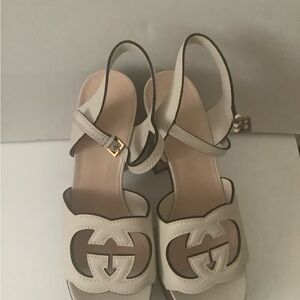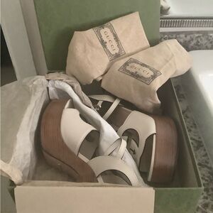 Elegant Gucci sandals with cream straps and wooden platform. Perfect for any occasion.