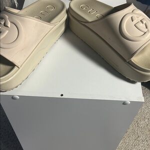 Stylish Gucci platform slides. Features iconic logo design. Comfortable and chic.