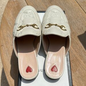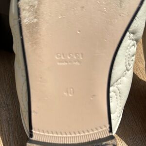 Experience luxury with these Gucci cream slippers, crafted from a soft suede-like material. The elegant design features a signature gold horsebit detail, adding a touch of sophistication to the backless slip-on style. Perfect for those seeking comfort and style in a high-end slipper.