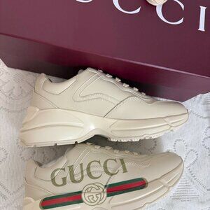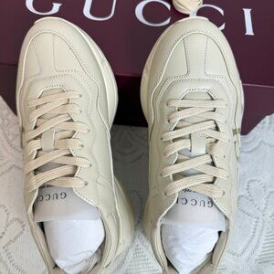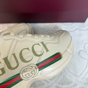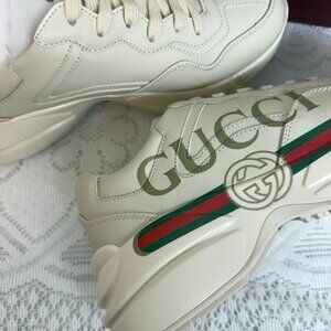 Stylish Gucci sneakers in cream. Features iconic green and red stripes. Perfect for casual wear.