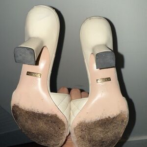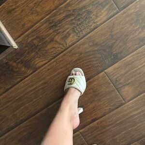Step into effortless luxury with these Gucci Cream and Gold Mules, a chic and versatile addition to any wardrobe. Featuring the brand’s signature gold-tone horsebit hardware, these mules perfectly blend classic elegance with contemporary style. The creamy leather upper exudes sophistication, while the sleek design ensures comfort and timeless appeal.