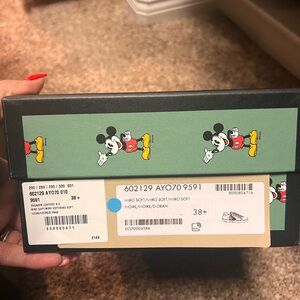 Stylish Gucci athletic shoes. Features iconic character design. Cream leather with orange accents.
