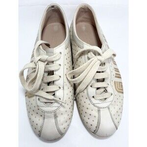 Stylish Gucci sneakers. Cream body with gold logo. Red heel accent. Perfect for casual wear.
