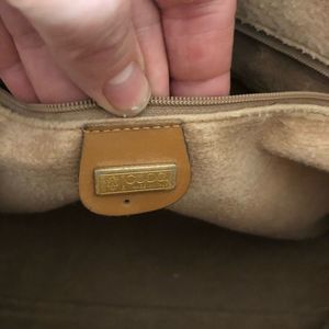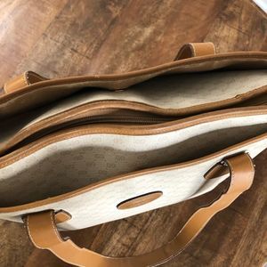 Elegant Gucci tote in cream with tan accents. Perfect for everyday use. Stylish and versatile.