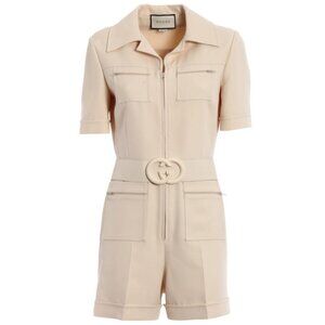 Gucci wool and silk blend crepe romper in size 38, brand new with tags. This '70s style short jumpsuit features a pointy collar, full zip front fastening, four patched zipped pockets, turn-ups at short sleeves and pants, removable leather lined belt with tonal interlocking G.