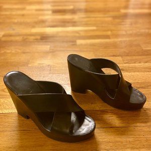 🌟Absolutely gorgeous platform black leather sandals with a peep toe and black cross-strap