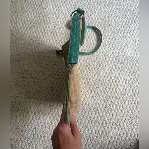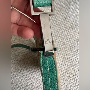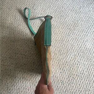 Stylish Gucci monogram GG canvas crossbody bag in a chic beige and teal leather color combination. Perfect for adding a touch of elegance to any outfit. Please see pictures for wear.