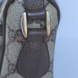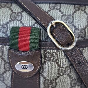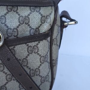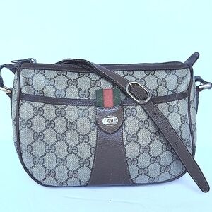 Stylish Gucci crossbody bag. Features iconic pattern. Brown leather accents. Green and red stripe detail. The handle has been repaired.