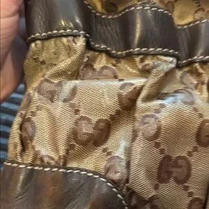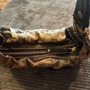 Gucci Crystal shoulder bag with signature GG monogram canvas. Dark brown leather trim and accents. Gold-tone hardware details. Soft slouchy hobo shape. Versatile everyday style.