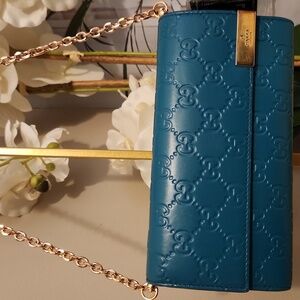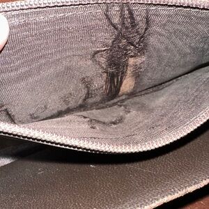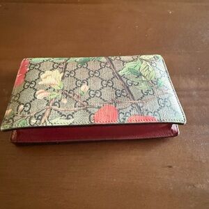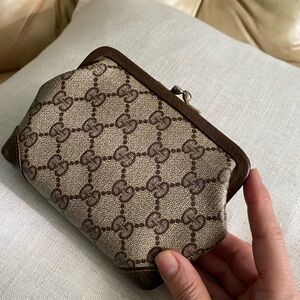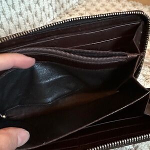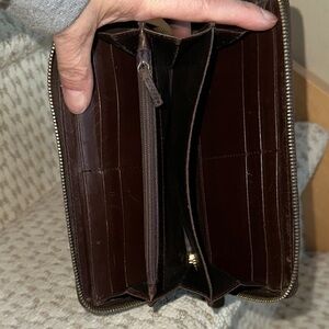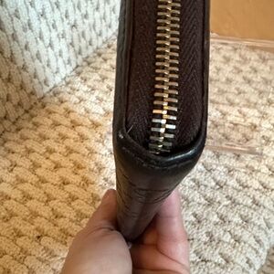 Luxurious Gucci wallet with GG embossed pattern. Dark brown leather. Zip-around style. Please note there are callouts on this wallet so be aware prior to purchasing as there are no refunds. The zipper pull has been replaced and is not authentic. Also the coin area of the wallet is frayed.