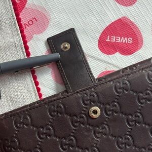 Elegant Gucci wallet with signature GG embossing. Dark brown leather with metallic accent.