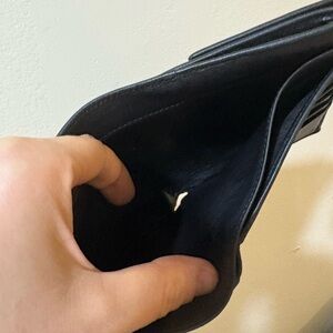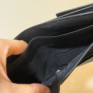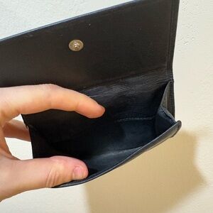 Sophisticated dark leather wallet. Features a sleek silver clasp. Ideal for daily essentials.