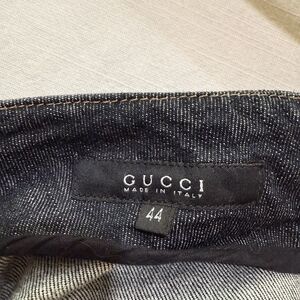 This is a Gucci denim skirt featuring a distinctive lace-up design at the front waist. Crafted from dark wash denim, the skirt combines casual structure with a touch of edgy detail. The front lace-up section includes metal eyelets but is currently missing the original laces, offering an opportunity to customize the look with your choice of tie or ribbon. Below the lacing, a structured front pleat adds movement and shape to the A-line silhouette. Finished with contrast stitching along the hem and seams, this piece blends relaxed denim styling with Guccis signature high-fashion craftsmanship. Size 44. Which is US size L