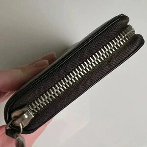 The exterior was refreshed with paint. Clean inside and outside. Coin section has some tears. There is tarnish on zipper teeth