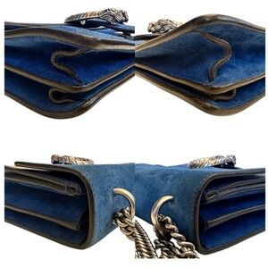 This stunning Gucci Dionysus bag is crafted from luxurious blue suede, making it a standout piece for any occasion. Featuring the iconic tiger head clasp, this bag is an elegant mix of classic design and contemporary style. The chain shoulder strap adds a touch of sophistication, while the spacious interior is perfect for holding your essentials. The bold blue hue and impeccable craftsmanship make this a must-have for any fashion lover. A true statement piece that effortlessly elevates any outfit.