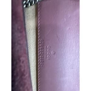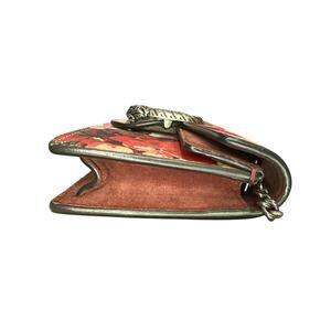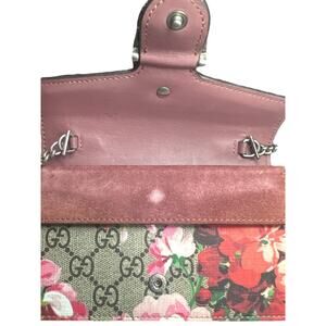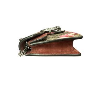 Gucci GG Supreme Monogram Flora Dionysus Shoulder Bag Bag is crafted of traditional Gucci GG monogram supreme canvas with a floral print. This bag features an aged silver chain shoulder strap and a textured horseshoe tiger spur closure that opens to an exterior suede flap. The flap opens to a beige interior with a key ring that can attach to a larger bag or keys.