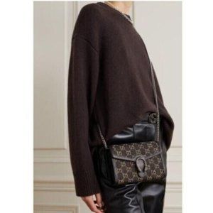 Gucci’s signature tropes – playful detailing and bold motifs– are evident in this season’s accessories. The Dionysus Mini Shoulder Bag is crafted from cotton in a denim weave, featuring a detachable chain shoulder strap, snap-fastening front flap closure, signature tiger head plaque, all-over GG logo jacquard and partitioned compartments.