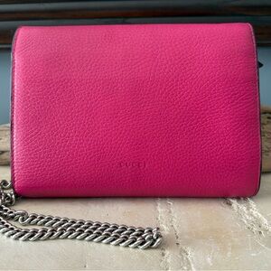 Beautiful Pink leather Gucci Dionysus wallet on stylish silver chain. In Excellent used condition. Features crystal encrusted hardware. This versatile bag can be carried as a clutch or worn crossbody. Easily holds a pro max phone and all of your essentials. Perfect for adding a pop of color to any outfit. Comes with box and dust bag.