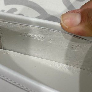 White leather and rubber sole. Aged silver Dionysus buckle with crystals.