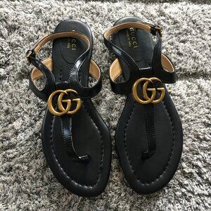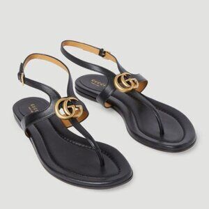 The emblematic Double G logo is representative of founder Guccio Gucci's initials, and has since been reworked in a variety of forms and interpretations. Here, the monogram defines this pair of black leather sandals.