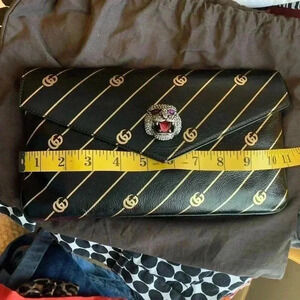 Authentic Gucci Clutch, Black Leather, Double G Logo & Tiger Head Accent, Gold Tone Hardware, Leather Trim, Nylon Lining And Single Interior Pocket With Card Slots, Snap Closure At Front. Hard To Find.