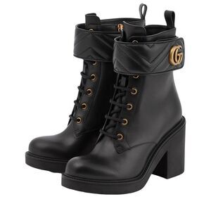 Gucci Double G Marmont Leather Combat Ankle Boots Lace up Black Gold 37