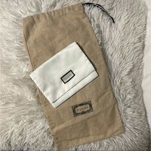 You get 4 Gucci Shoe dust bags set (8 total), one Gucci Purse bag, one Gucci Jewelry bag, and a Gucci Linen long bag. 11 total, all in excellent condition been in a storage container, very small mark one one of the shoe bag towards the top tie and really not noticeable when shoe is in it and tied. Cover up your beautiful items with these dust bags I just have way too many! Will send with ribbon and box! All AUTHENTIC that I’ve personally bought myself in stores! CROSS POSTED FOR LESS!