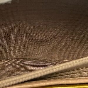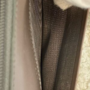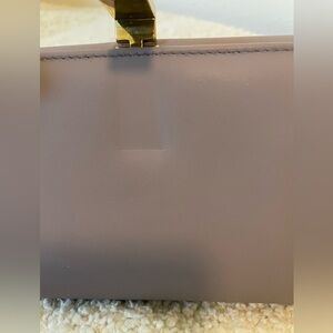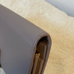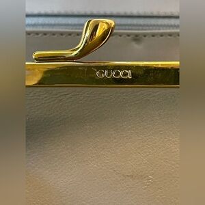 In good, pre-owned condition. Exterior has a few small white marks and minor rubbing by the bar lock with a couple of dark marks. Could potentially be cleaned. Corners are in good shape with a little discoloration on one side. There is an indentation where the bar lock closes. Small marks on the hardware. Interior is very clean with some marks and indentation in the coin pouch and a small indentation where the kiss lock and bar lock rest. See photos for wear and condition.