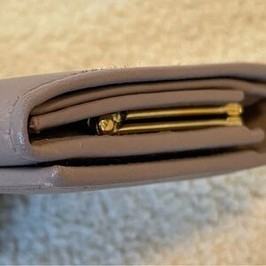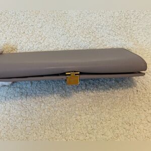 Gucci Long Wallet in dusty purple with bar closure. Kiss lock coin pouch. Multiple card holders and cash/receipt slots. Zip pouch. Gold tone hardware.