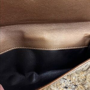 This is an authentic GUCCI Monogram Lovely Heart Continental Wallet in Brown. This stunning clutch wallet is crafted of classic Gucci GG monogram canvas with a light brown leather trim. It features a cross-over flap that opens with the Gucci emblem. Inside the wallet is a partitioned matte leather interior with card slot panels, a zipper partition divider, and open spaces.Normal signs of wear some marks in interior hardware has tarnish corners are excellent