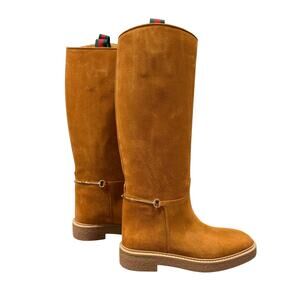 Gucci Edith Tall Knee-High Suede Riding Boots Cognac Horsebit Web EU 39