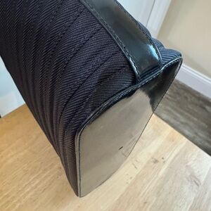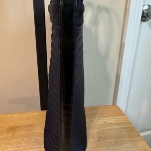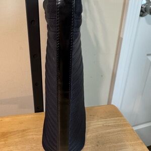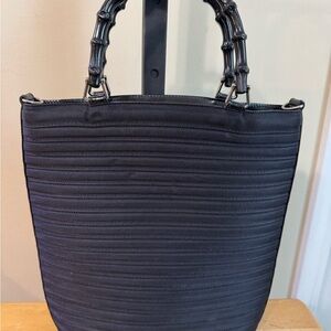This elegant black Gucci tote bag is perfect for any occasion. Featuring a sleek design and comfortable Bamboo handles, it combines style and functionality effortlessly. SN: 002.1998.0353; Size: 11.5x11x3.5”; Condition: Very Good; Exterior has ribbed design, shows minimal signs of use; does show indentations from the handles; Handles were repainted and sealed; Interior is clean; shows some signs of use; Includes shoulder strap.