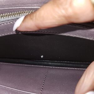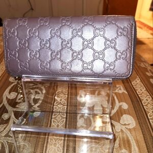 Elegant Gucci wallet with embossed logo pattern. Features a sleek design in a rich brown/lavender color. Serial number is located in front pocket. This wallet is amazing! only call-out is a white dot in inside pocket (see pictures)